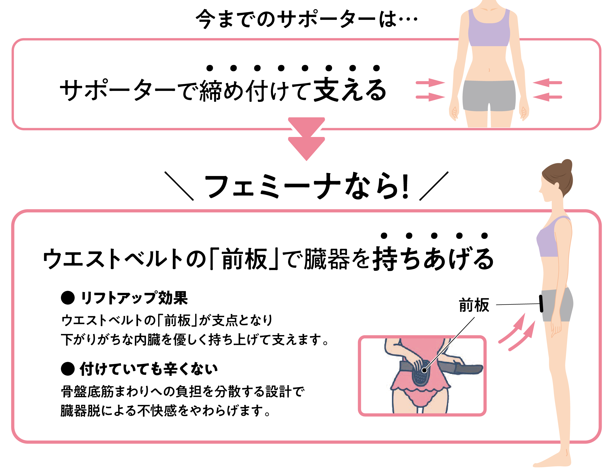 ・お腹前部に前板を設けた斬新な構造(日本初)で臓器を持ちあげる
