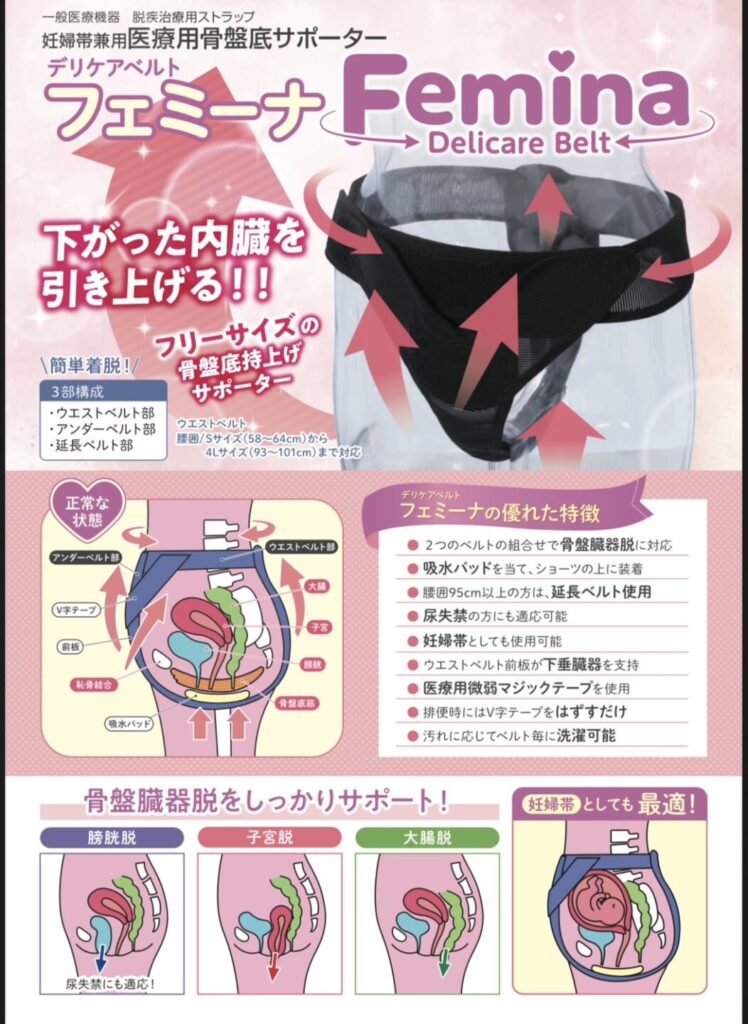 Delicare Belt Femina(デリケアベルト フェミーナ)は、尿もれや臓器下垂(子宮脱・膀胱瘤・直腸瘤など)に悩む方、また妊娠中期の妊婦さんにも対応した医療用骨盤底サポーターです。